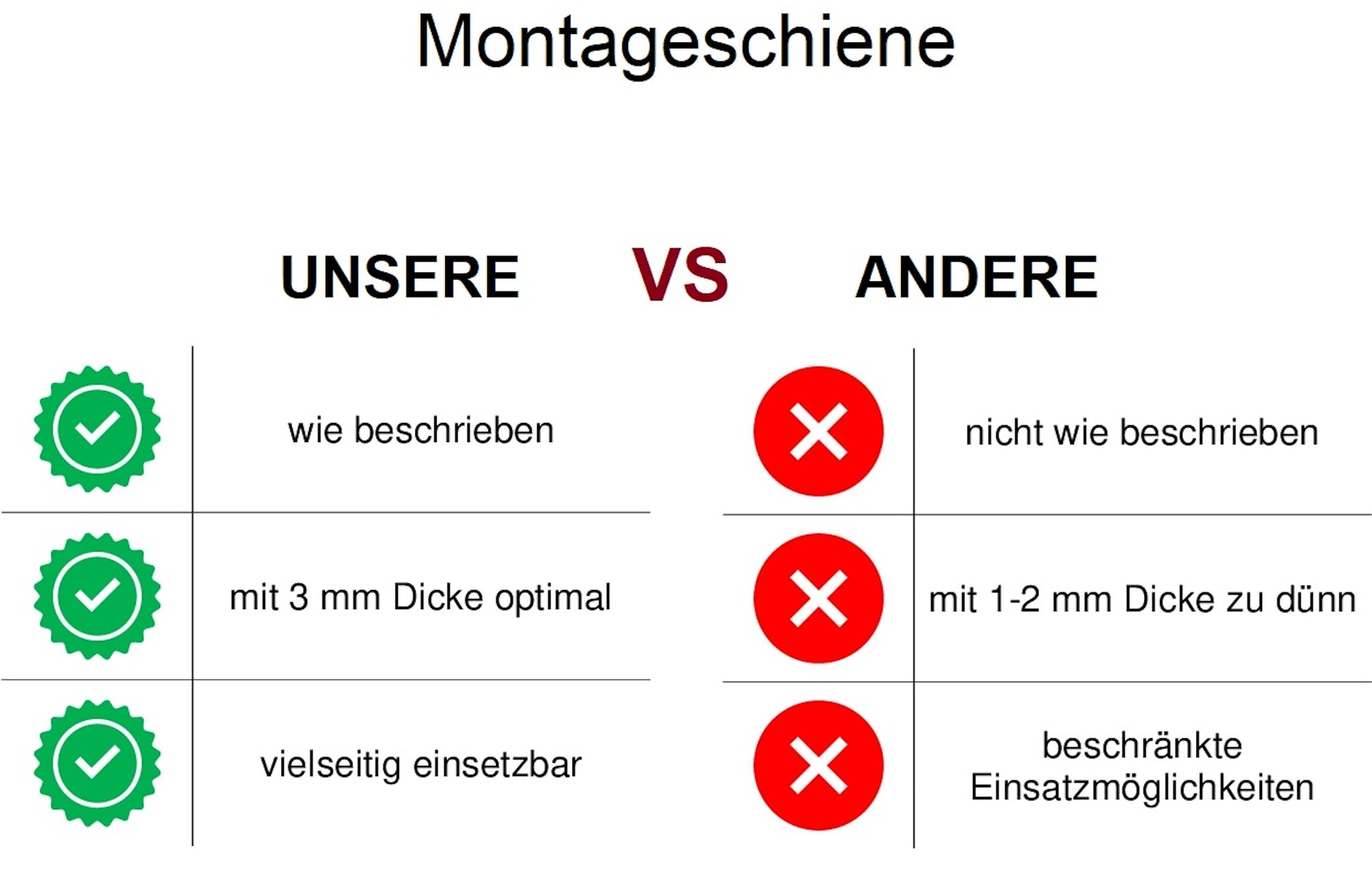 SEHR STABIL IM GEGENSATZ ZU VIELEN ANDEREN: Unsere U-Montageschiene hat durch die 3 mm Materialstärke eine sehr hohe Stabilität. Viele andere Montageschienen verformen sich schnell, da diese meistens zwischen 1-2 mm Materialstärke besitzen